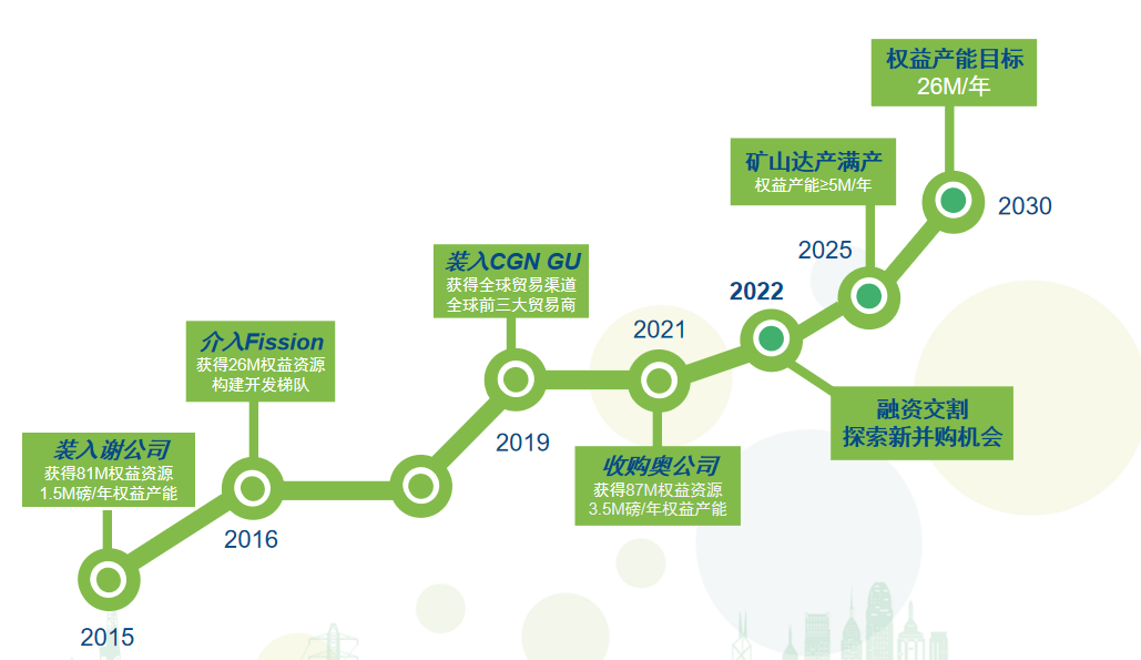 ◇ 2015年,收購哈薩克斯坦謝米茲拜伊鈾公司49%股權,并獲得下轄兩座在運鈾礦49%的天然鈾產品包銷權。中廣核礦業成為一家主業清晰的鈾資源開發和貿易公司。 ◇ 2016年,收購加拿大上市公司Fission Uranium Corp 19.99%股權,并獲得20%的天然鈾產品包銷權及額外的15%的包銷選擇權。中廣核礦業成功介入加拿大高品位鈾礦項目,成為Fission公司單一最大股東。 ◇ 2016年,中廣核礦業與哈薩克原子能工業股份有限公司簽署《鈾礦原則協議》及其補充協議,約定雙方就總資源量達4萬噸鈾的鈾礦山開展合作,其中公司未來總包銷量將不低于2萬噸鈾。 ◇ 2016年,復星集團認購中廣核礦業9.99%股權。 ◇ 2019年,中廣核礦業完成對中廣核國際鈾產品銷售有限公司100%股權的收購。 ◇ 2021年,收購哈薩克斯坦奧爾塔雷克公司49%股權,并獲得下轄兩座在運鈾礦49%的天然鈾產品包銷權。 ◇ 2022年,中廣核礦業引入混改基金為首11家投資人完成交割。