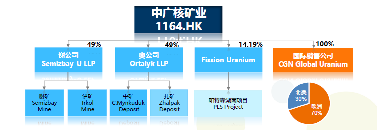 中廣核礦業(yè)的主要業(yè)務(wù)是核能企業(yè)使用的天然鈾資源的開發(fā)與貿(mào)易。公司目前持有資產(chǎn)包括: 1.哈薩克斯坦謝米茲拜伊鈾公司49%的權(quán)益和產(chǎn)品包銷權(quán)。 2.哈薩克斯坦奧爾塔雷克公司49%的權(quán)益和產(chǎn)品包銷權(quán)。 3.加拿大鈾礦勘探公司FissionUraniumCorp.14.19%的股權(quán),和20%的天然鈾產(chǎn)品包銷權(quán)以及額外15%的包銷選擇權(quán)。 3.中廣核國際鈾產(chǎn)品銷售有限公司100%的股權(quán)。